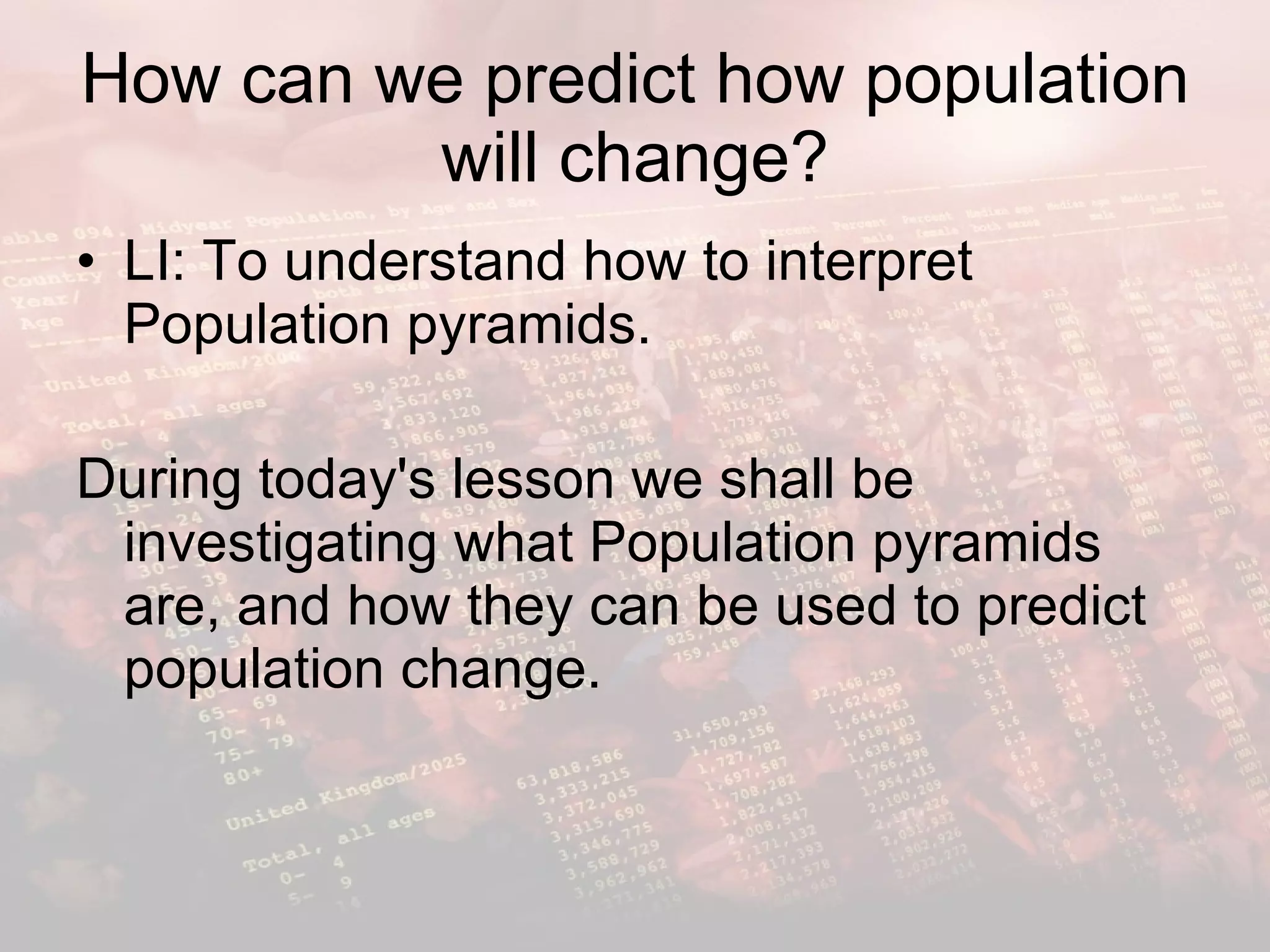 The document discusses using population pyramids to predict population change. It provides population data for the UK in 2010 and 2050 broken down by age and gender. Population pyramids visually depict this data using bars to show male and female populations in each age group. Comparing pyramids from different times allows predicting how a population will change in the future. The homework is to create a 3D population pyramid for the UK in 2050 using materials like Lego bricks or jelly babies and compare it to the 2010 pyramid.