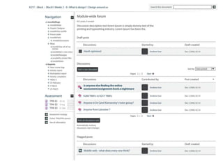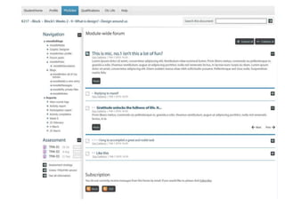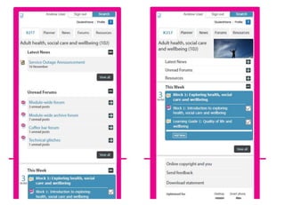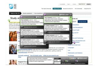 The Open University is migrating from Moodle 1.9 to Moodle 2.1, aiming to improve functionality and scalability while managing a large user base of 770,000 registered users. The transition involves running both versions in parallel to maintain service continuity, with significant upgrades like enhanced modules and better mobile support. Key performance metrics indicate high transaction rates, with new tools like an annotation feature being introduced for improved user experience.