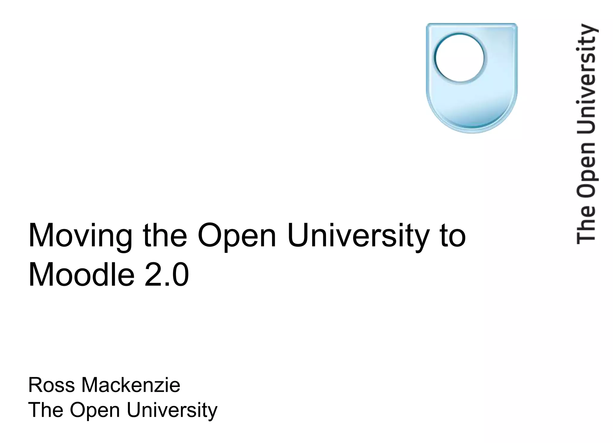 The Open University is migrating from Moodle 1.9 to Moodle 2.0/2.1 to take advantage of new features and enhance custom modules. With over 770,000 users accessing over 500 courses daily, performing the migration while the university is active poses challenges. The migration will be done progressively as courses end over multiple years to minimize disruption. Performance has been tested and infrastructure expanded to support the higher volume. New themes and mobile optimization and annotation tools will enhance the user experience in the new platform.