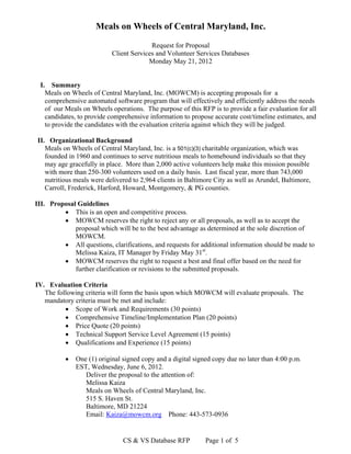 Meals on Wheels of Central Maryland is seeking proposals for a software program to manage their client services and volunteer databases. They deliver over 750,000 meals annually to nearly 3,000 clients through over 2,000 volunteers. The software must track client information and services, volunteer information, and meal delivery logistics while complying with security, reporting, and accessibility standards. Proposals are due by June 6th and will be evaluated based on scope of work, implementation timeline, price, support services, and experience.