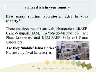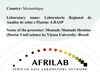 The document details a presentation by Momade Mamudo Ibraimo on soil analysis in Mozambique, highlighting the existence of three fixed routine laboratories. It discusses the strengths of the laboratorial team, their focus on tropical soils, and areas for improvement such as maintenance and technical support. Expectations from the meeting include harmonization of laboratory procedures and enhanced technical collaboration.