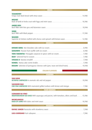 This document contains the menu for a restaurant, listing various starters, soups, fish, pasta, meat, and dessert options. Starters include shrimp cocktail, smoked ham, and beef carpaccio. Soups include cream of vegetables, fish soup, and tomato soup. Main dishes for fish include dourada, scabbard fish, salmon, grouper, and cod. Pasta options are tagliatelle with shrimp and ricotta tortelloni. Meats listed are duck, lamb, beef fillet, and chicken. Desserts include hot chocolate cake, passion fruit soufflé, pineapple carpaccio, fresh fruit, banana strudel, and honey cake. The second section features Italian dishes