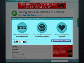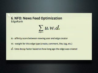The document discusses social design and the Facebook platform. It provides tips for using Open Graph tags and actions like Like, Send, and Share to optimize content distribution and engagement. It also covers connecting apps to Facebook for identity, personalization using social context, and driving distribution by making sharing easy. The goal is to identify users, add value at key touchpoints, and enable contribution back to the social graph.