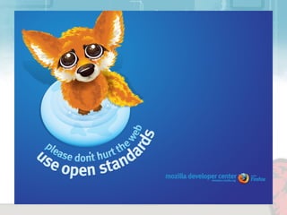 The document outlines Mozilla's 2010 goals, emphasizing openness, participation, and innovation through the Firefox web browser. It highlights features of Firefox 3.5 and 3.6, including enhancements for web developers and support for geolocation and web workers. The document also discusses the importance of add-ons for customization, user engagement, and a vibrant startup ecosystem around Mozilla's tools and technologies.