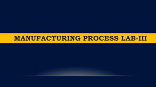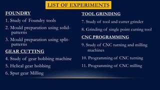 The document describes various manufacturing processes including foundry, gear cutting, and tool grinding. In foundry, it discusses mould preparation using solid and split patterns. For gear cutting, it explains gear hobbing and spur gear milling processes. It provides steps to make moulds and cut gears. It also provides specifications of a gear hobbing machine.