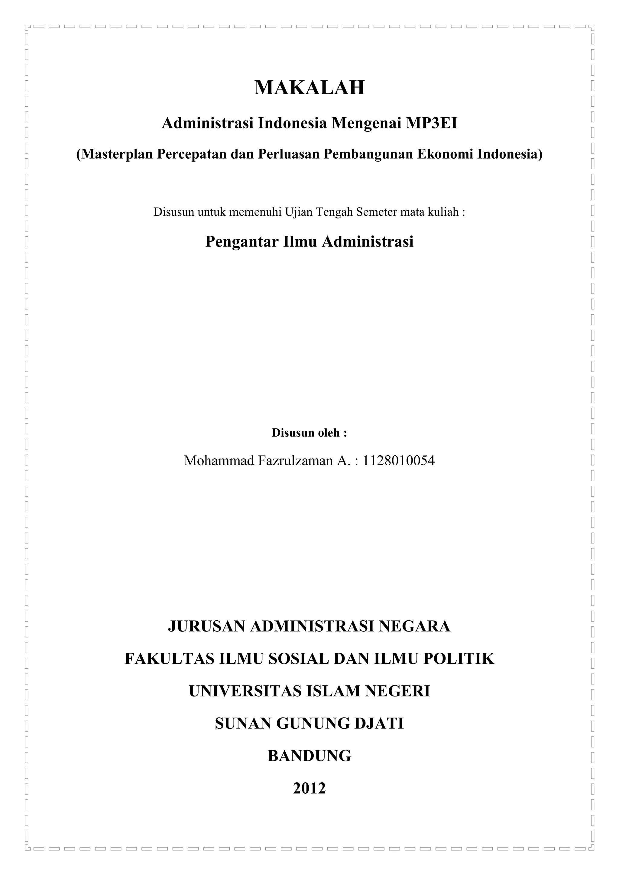 Makalah ini membahas administrasi pemerintah Indonesia terkait dengan MP3EI (Masterplan Percepatan dan Perluasan Pembangunan Ekonomi Indonesia). Makalah ini disusun untuk memenuhi ujian tengah semester mata kuliah Pengantar Ilmu Administrasi oleh Mohammad Fazrulzaman dari Jurusan Administrasi Negara FISIP Universitas Islam Negeri Sunan Gunung Djati Bandung tahun 2012.