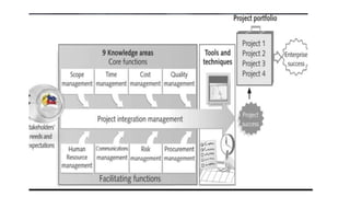 The document discusses key concepts in project planning and management. It defines a project as a temporary endeavor undertaken to create a unique product or service. Projects go through various phases known as a project life cycle, including initiation, planning, execution, monitoring and control, and closing. Key elements of project management include developing a project charter, work breakdown structure, timelines, budgets, and requirements documentation. Stakeholder management is also essential, identifying stakeholders and their needs and expectations for the project. Effective planning lays the groundwork for successful project execution and completion.