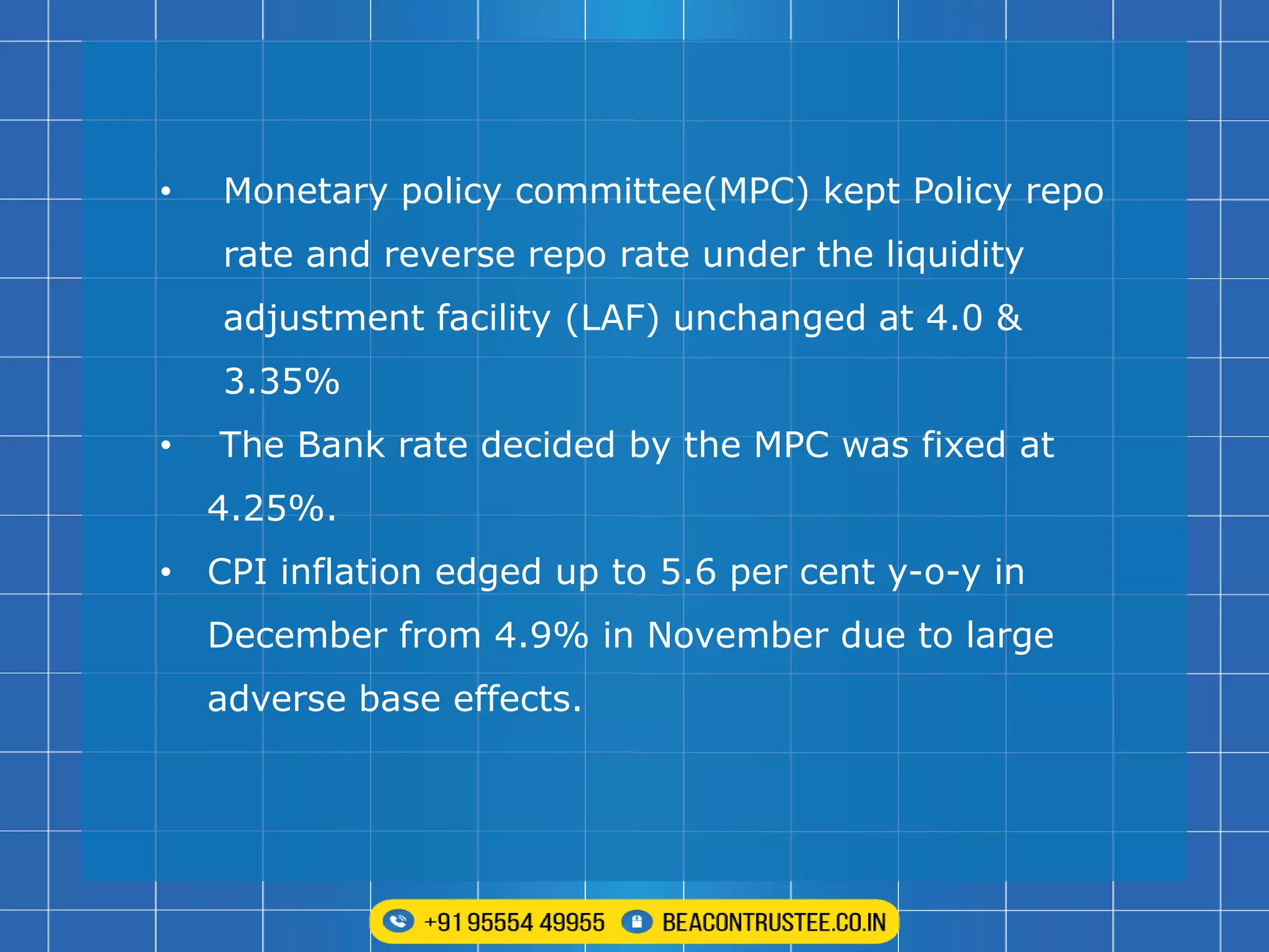 The Monetary Policy Committee kept the repo and reverse repo rates unchanged at 4.0% and 3.35%, respectively, while projecting a CPI inflation of 4.5% for 2022-23. India's GDP for 2021-22 grew by 9.2%, exceeding pre-pandemic levels, with a projected real GDP growth of 7.8% for 2022-23 amidst global economic uncertainties. Continued policy support is necessary to drive domestic recovery and keep inflation within target levels.