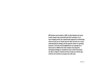 MP Creative was founded in 2001 to provide advertising and branding services to lifestyle and luxury brands. They take a sophisticated approach, focusing on strategy and understanding client needs. Their services include art direction, branding, campaign creation, consulting, digital strategy, design, and online strategy. They have worked with brands such as H&M, Aldo, Jil Sander, and Uniqlo on campaigns, rebranding, and building the overall brand experience across channels.