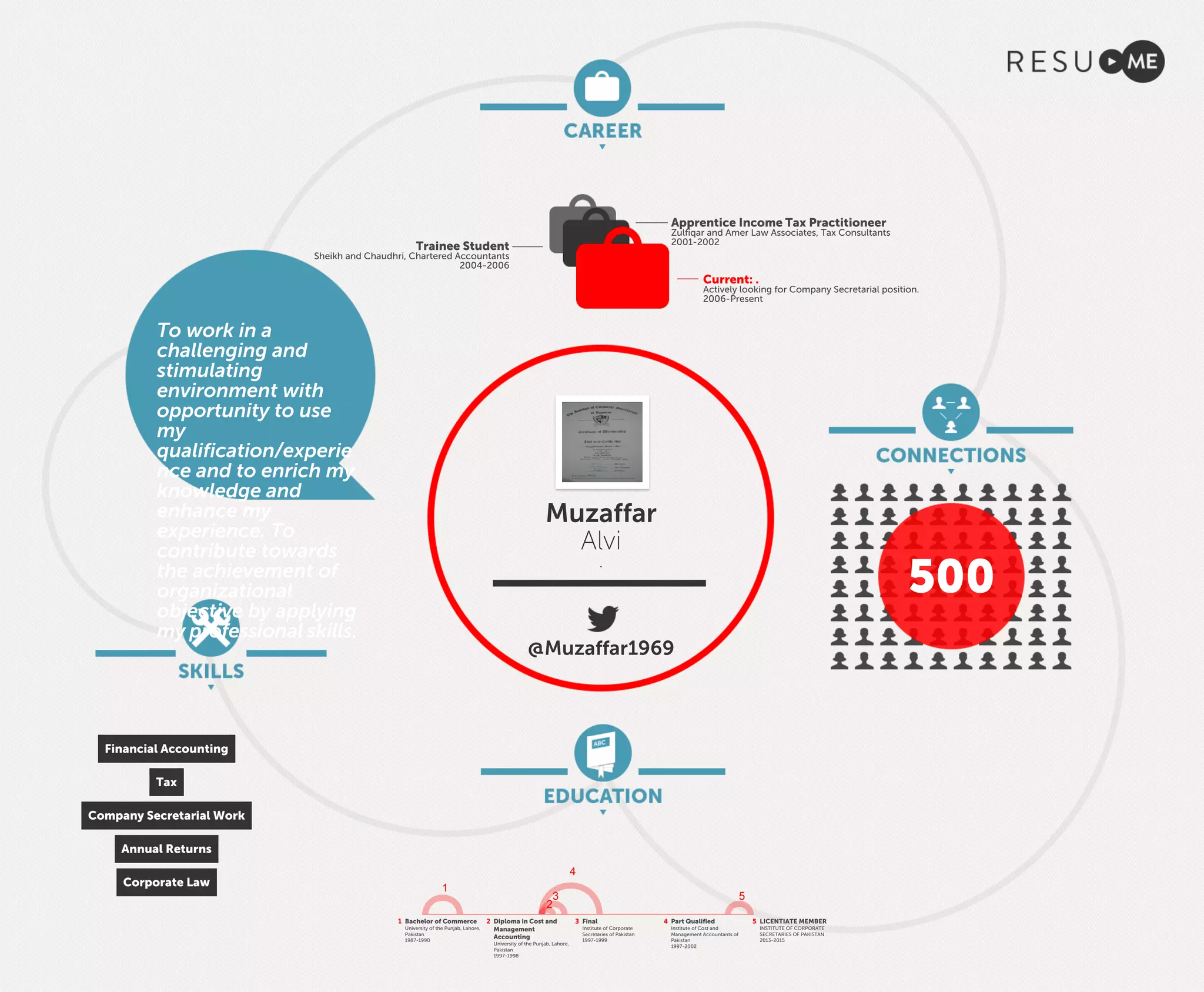 Muzaffar Alvi is seeking a company secretarial position where he can utilize his qualifications and experience in financial accounting, tax, and company secretarial work. He has a Bachelor of Commerce degree from the University of the Punjab and diplomas in cost and management accounting and as a finalist from the Institute of Corporate Secretaries of Pakistan. His previous work experience includes positions as a trainee at an accounting firm and as an apprentice income tax practitioner.
