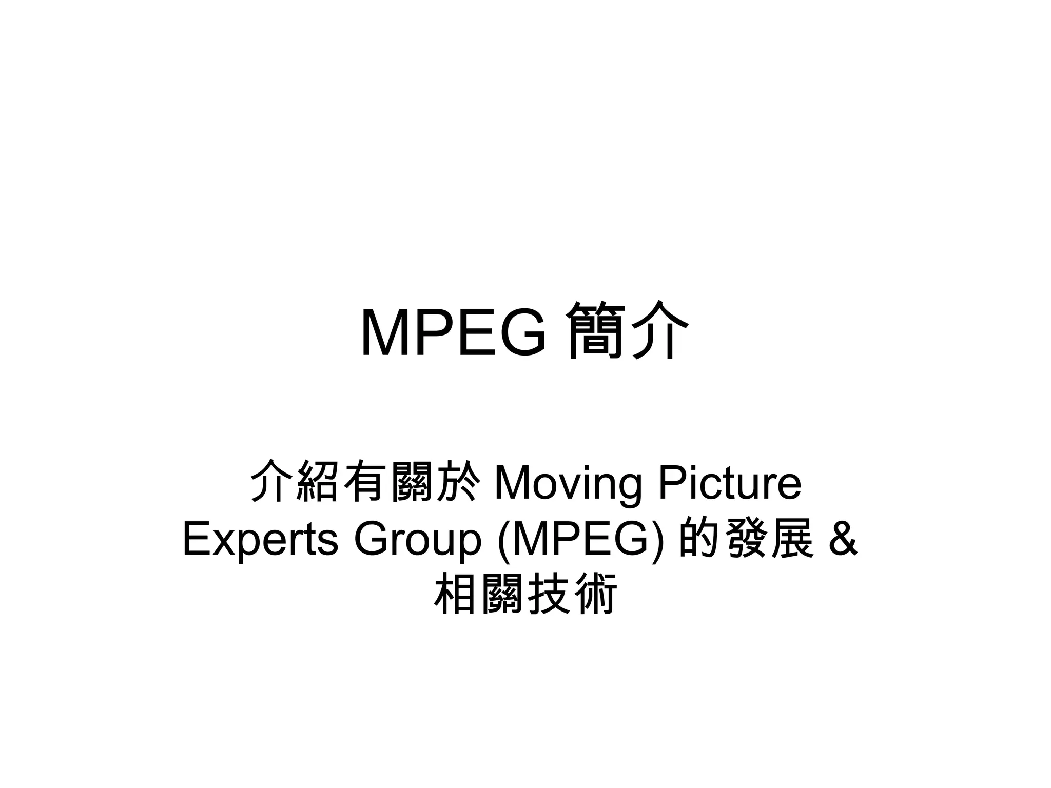 本文件介绍了移动图像专家组(MPEG)的发展历程及其多个标准,包括MPEG-1、MPEG-2、MPEG-4、MPEG-7和MPEG-21。每个标准都针对视频和音频的压缩与传输提供了不同的技术解决方案,并在无数媒体应用中取得了广泛应用。特别是MPEG-1的MP3成为了流行的音频压缩格式,而MPEG-4则进一步扩展了功能,如数字版权管理和低位元率编码。