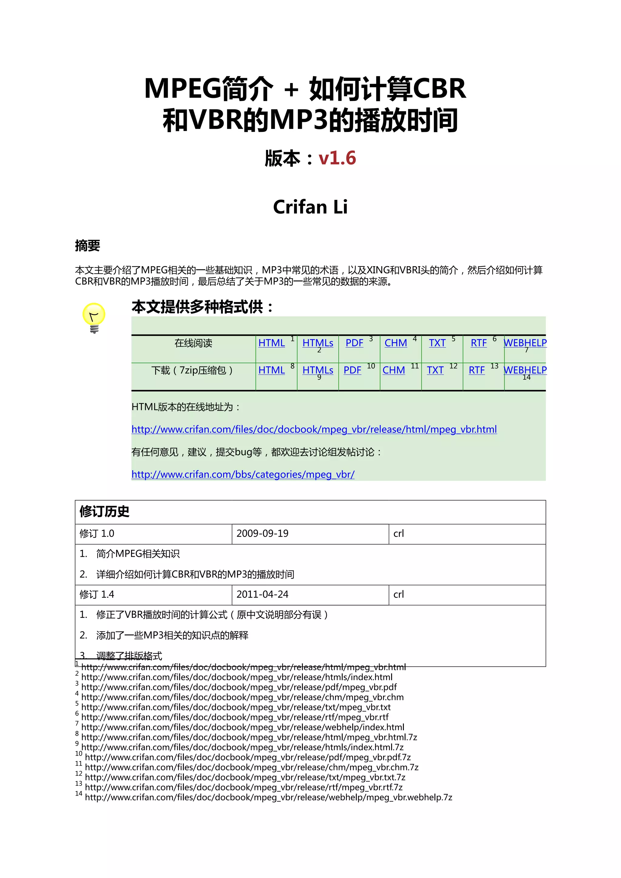 本文介绍了mpeg的基础知识及其在mp3中的应用,包括常见术语和不同帧之间的关系。它详细讲解了如何计算cbr和vbr的mp3播放时间,并介绍了xing和vbri头的概念。最后,文中总结了一些关于mp3的重要信息和相关数据来源。
