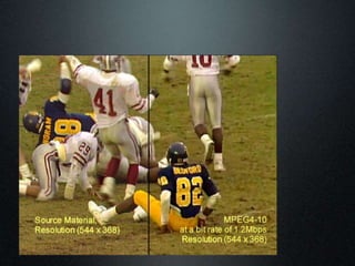 This document compares video compression standards MPEG-4 and H.264. It discusses key factors for video compression like spatial and temporal sampling. It provides an overview of MPEG-4 including object-based coding, profiles and levels. H.264 is introduced as a standard that provides 50% bit rate savings over MPEG-2. Profiles and levels are explained for both standards. Common uses of each are listed, along with future development options.