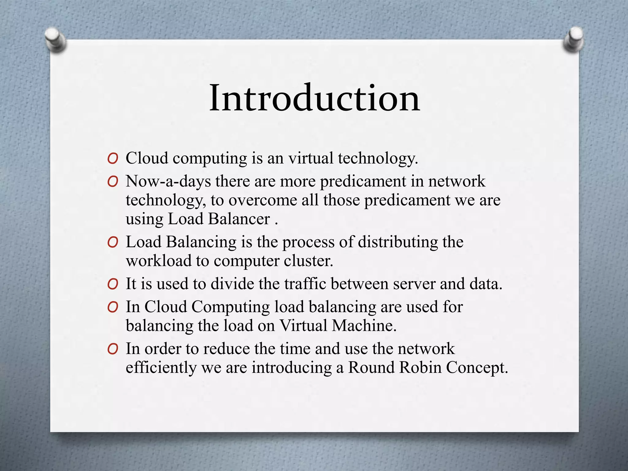 Load balancing is used to distribute workloads across multiple servers in cloud computing. It aims to optimize resource use and minimize response time. The document proposes using a round robin approach to distribute loads from virtual machines across servers periodically to reduce server workload and use networks efficiently. Key benefits outlined are high scalability, availability, and flexibility to balance various protocols and route traffic based on server health. The conclusion states that load balancing is important in cloud computing to distribute work evenly for high user satisfaction and resource utilization, though further research is still needed.