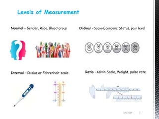 This document discusses parametric and non-parametric statistical methods. It defines different levels of measurement and provides examples of parametric and non-parametric tests. Key points include: