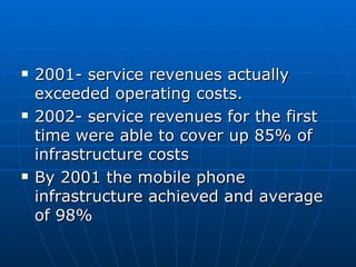 The mobile phone market continued growing rapidly between 1990 and 2005, with the number of subscribers increasing dramatically worldwide. By 2001, mobile service revenues exceeded costs and covered 85% of infrastructure expenses. Subscriber bases substantially increased in all major markets, with Asia reaching 215 million subscribers and Europe reaching 35 million subscribers by 2005. Mobile phone technology evolved so that phones became ubiquitous, with people carrying them all the time, including young adults taking phones to school.