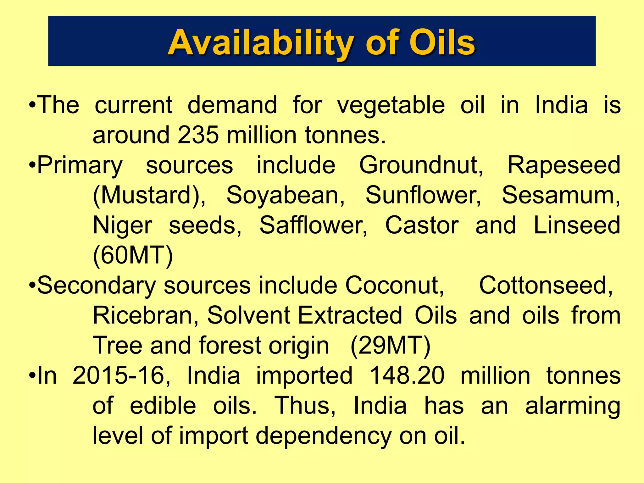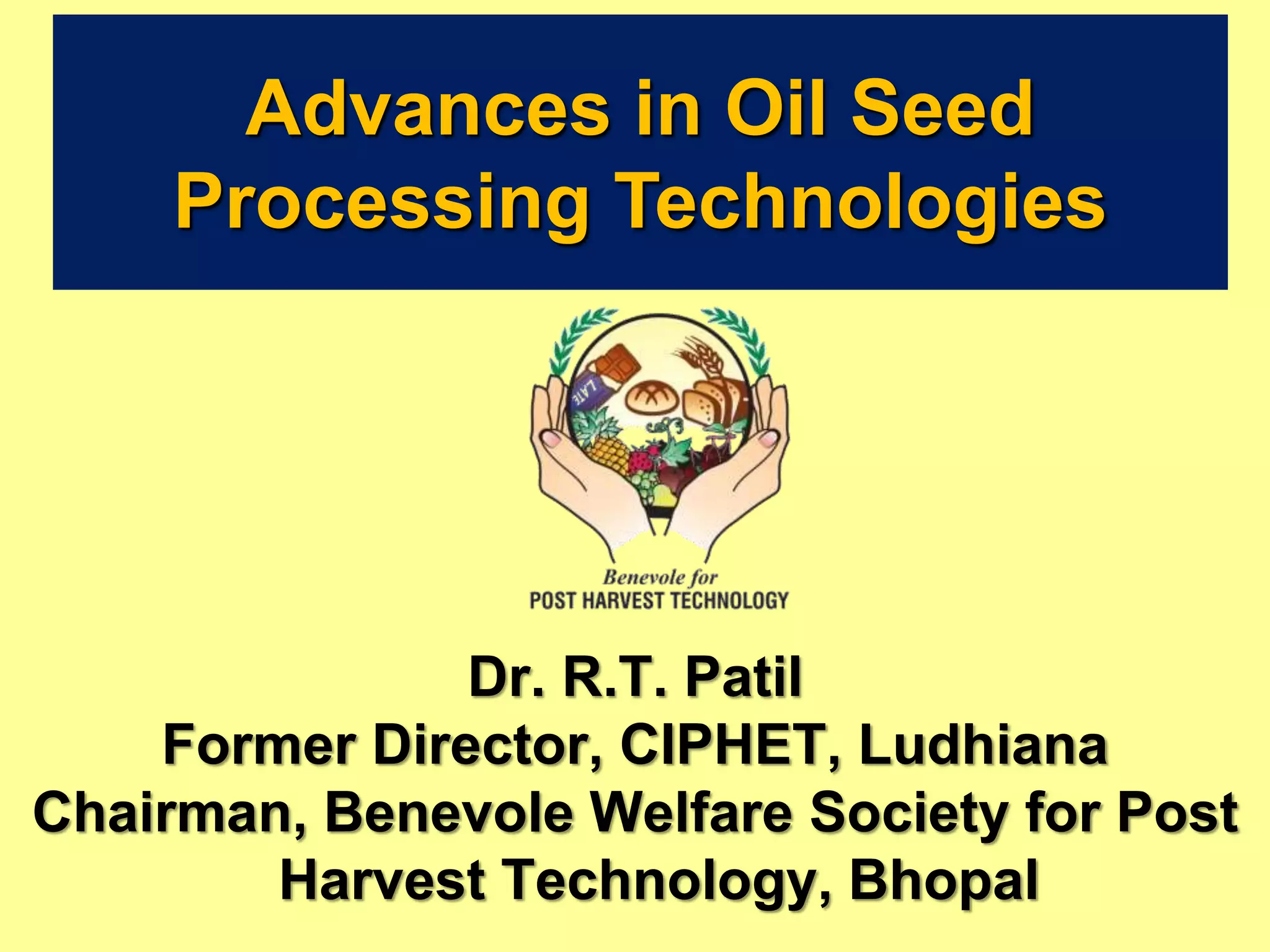The document discusses advances in oil seed processing technologies in India. It summarizes India's current demand and domestic production of vegetable oils as well as import dependency. It then describes post-harvest losses for various oilseeds and their oil contents. The document proceeds to discuss smart interventions for oil extraction, including mechanical expression, solvent extraction, and various assisted solvent extraction methods like enzyme-assisted, ultrasound-assisted, microwave-assisted, and supercritical fluid extraction. It concludes by emphasizing the need for modernizing oil milling technologies in India to improve oil recovery and quality.