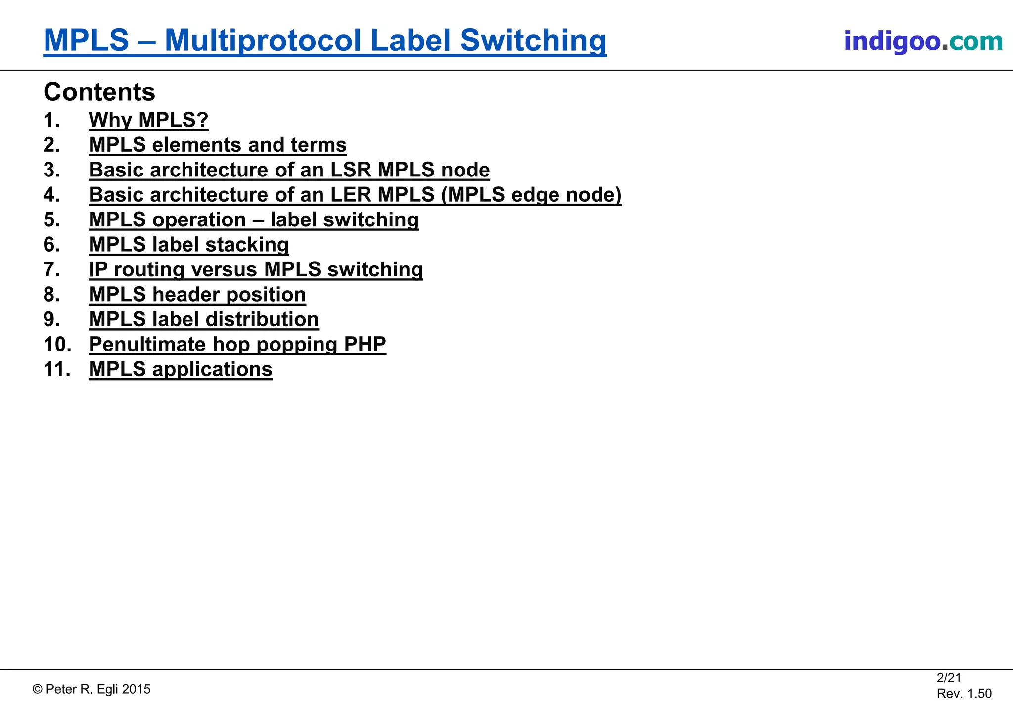 The document provides an overview of Multiprotocol Label Switching (MPLS), which integrates layer 3 routing with layer 2 switching to optimize network usage. It explains the benefits of MPLS over traditional methods like ATM and standard IP routing, along with key components and terminologies used in the architecture of MPLS nodes. Additionally, the document covers MPLS operations, such as label switching and stacking, while contrasting IP routing with MPLS switching.