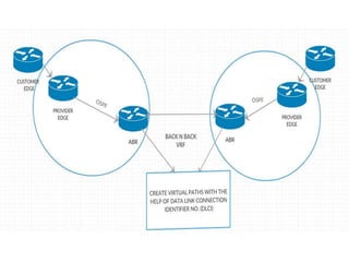 The document discusses MPLS-based VPN connectivity among inter-provider ISPs, focusing on how VPNs utilize shared infrastructures for secure remote access across geographically separated sites. It outlines the architecture and processes involved, including the use of MPLS for efficient data forwarding and the redistribution of VPN information between ISPs. Two methods for achieving cross-ISP VPN connectivity are proposed, namely back-to-back VRF and ASBR-to-ASBR approaches, highlighting their configurations and functionalities.