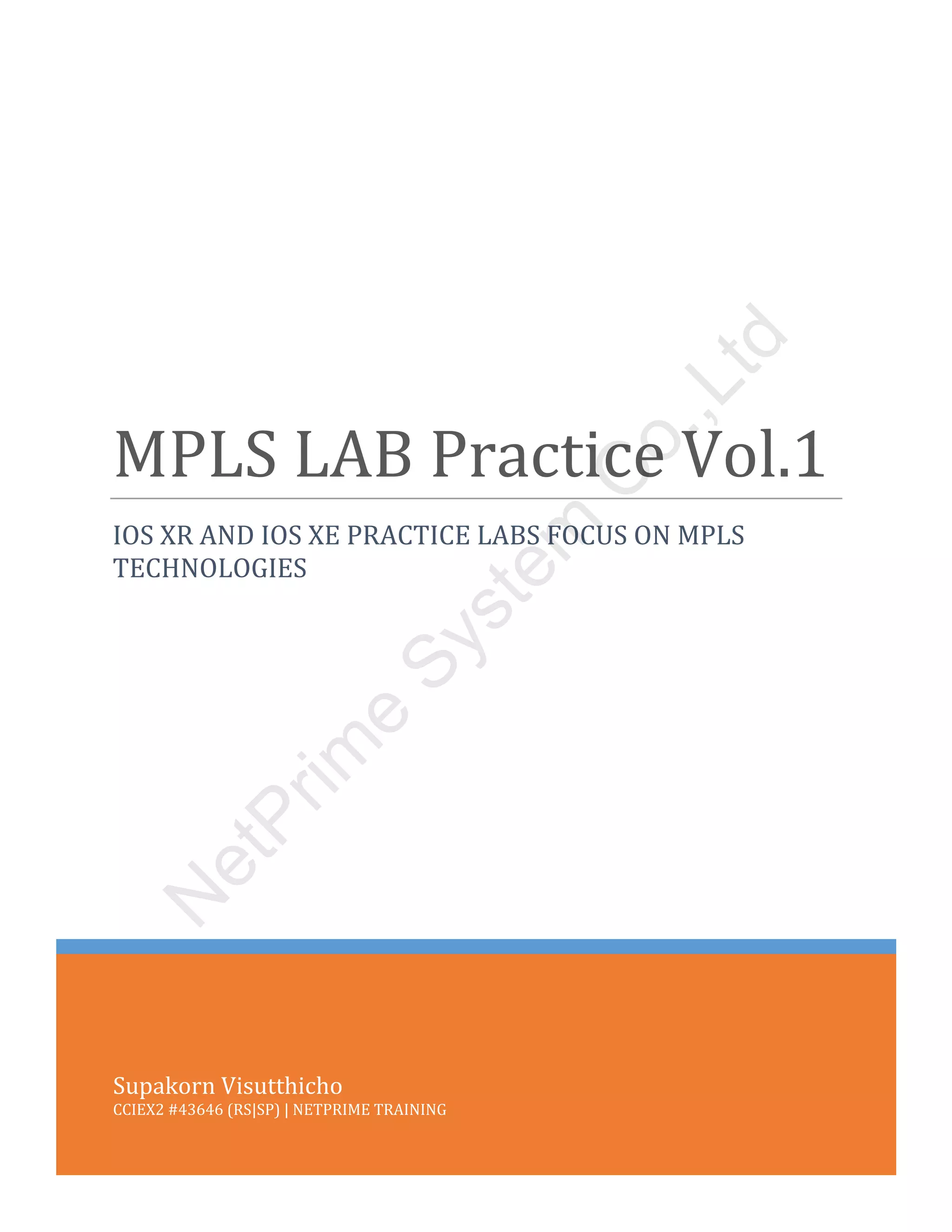 The document describes a series of MPLS Layer 3 VPN labs focusing on different routing protocols between the provider edge (PE) and customer edge (CE) routers. The first lab sets up a basic MPLS L3 VPN using static routes between the PE and CE routers to establish connectivity between two remote customer sites. Subsequent labs will configure the PE-CE routing with EIGRP, OSPF and BGP to explore different routing options.