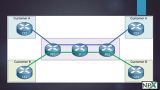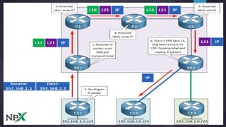 This document explains MPLS Layer 3 VPNs. It discusses how Layer 3 VPNs allow routing information to be shared between customer sites using protocols like OSPF and BGP across the service provider's MPLS network. It describes how Virtual Routing and Forwarding instances (VRFs), MP-BGP, Route Distinguishers (RDs), and Route Targets (RTs) work together to separate routing information for different customers and establish VPN connectivity between their sites while avoiding overlapping address spaces.