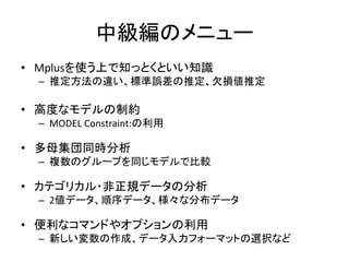 このスライドのコードはMplusデモ版で実行可能です。 http://www.statmodel.com/demo.shtml また、こちらのページにサンプルデータを置いています。 http://bit.ly/12NgDmI 初級編はこちらをどうぞ。 http://www.slideshare.net/simizu706/mplus-lecture-1