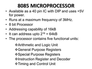 The document discusses the 8085 microprocessor. It contains details about its architecture, registers, buses, instructions and interrupts. The 8085 is an 8-bit microprocessor available as a 40-pin IC that runs at 3MHz maximum frequency. It has five functional units: ALU, general purpose registers, special purpose registers, instruction register and decoder, and timing and control unit. The document describes each of these units and their roles in the 8085 architecture.