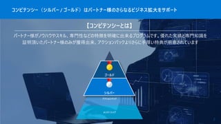 コンピテンシー(シルバー / ゴールド)はパートナー様のさらなるビジネス拡大をサポート 2 【コンピテンシーとは】 パートナー様がノウハウやスキル、専門性などの特徴を明確に出来るプログラムです。優れた実績と専門知識を 証明頂いたパートナー様のみが獲得出来、アクションパックよりさらに手厚い特典が用意されています メンバーシップ アクションパック ゴールド シルバー ゴールド シルバー