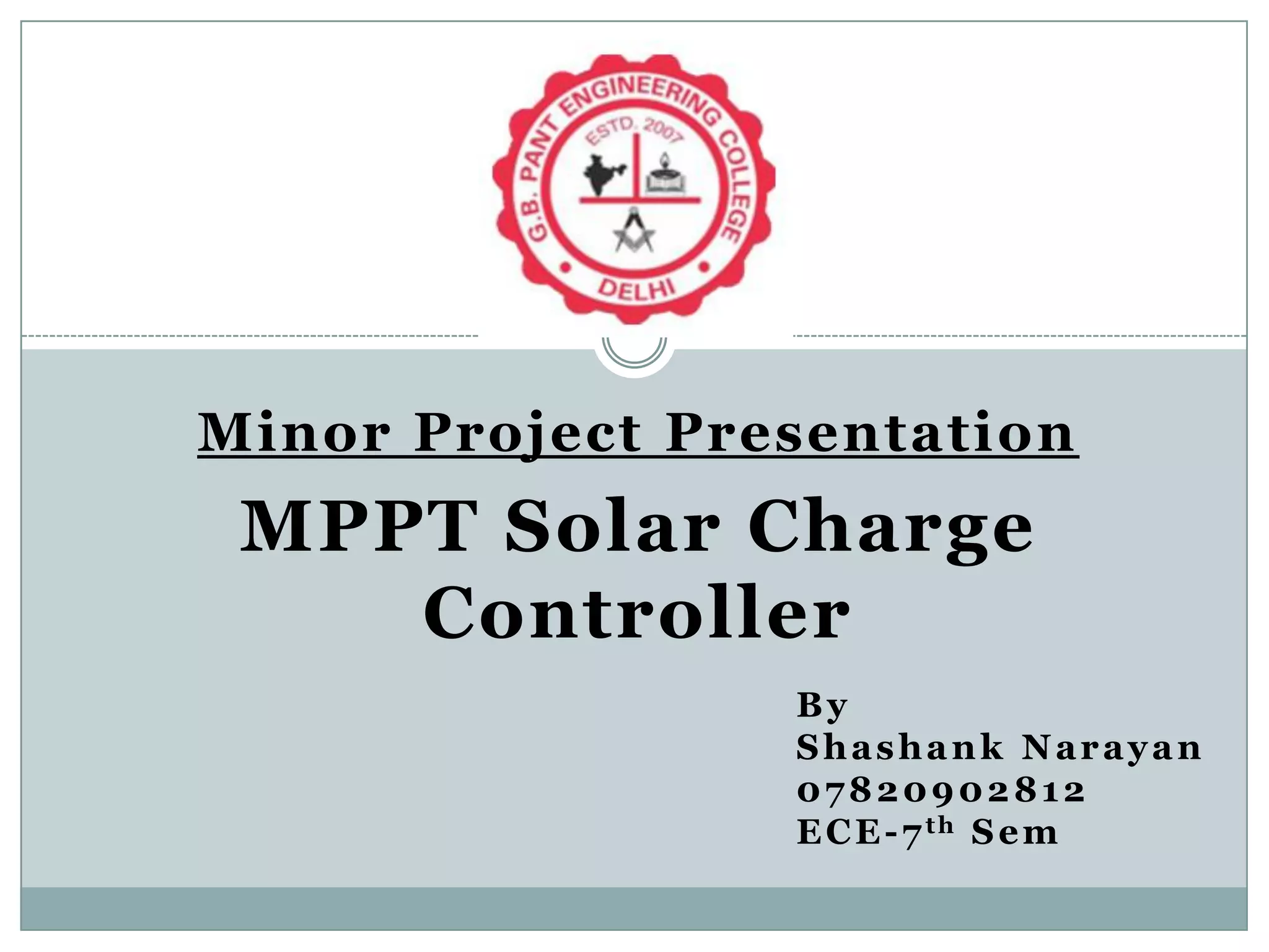 The document presents a solar charge controller utilizing maximum power point tracking (MPPT) technology for enhanced efficiency in off-grid photovoltaic systems. It describes the controller's ability to manage and optimize battery charging for various atmospheric conditions while supporting AC-DC devices of up to 500 watts. The system features include automatic battery control, reverse current blockage, and a microcontroller-based algorithm for maximizing solar energy usage.