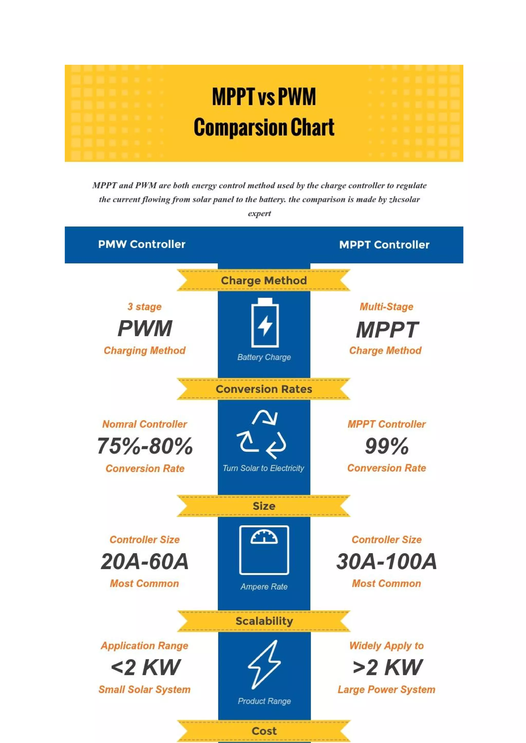The document compares MPPT (Maximum Power Point Tracking) and PWM (Pulse Width Modulation) solar charge controllers, outlining their principles, efficiency, pricing, and unique features. MPPT offers higher conversion efficiency and is suitable for larger systems, while PWM is cost-effective for small off-grid applications. Ultimately, the recommendation suggests MPPT for more complex needs and PWM for simpler, budget-friendly setups.