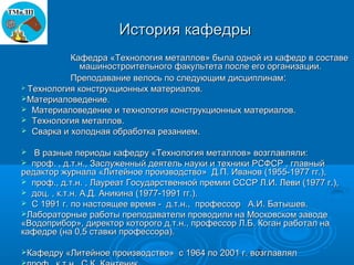 Документ описывает историю и структуру кафедры 'технология металлов и литейных процессов' на машиностроительном факультете. В нем перечислены специалисты кафедры, их достижения и образовательные программы, а также международное сотрудничество и научно-исследовательская деятельность. Кафедра активно ведет учебную и методическую работу, разрабатывает новые учебные пособия и участвует в международных конференциях.