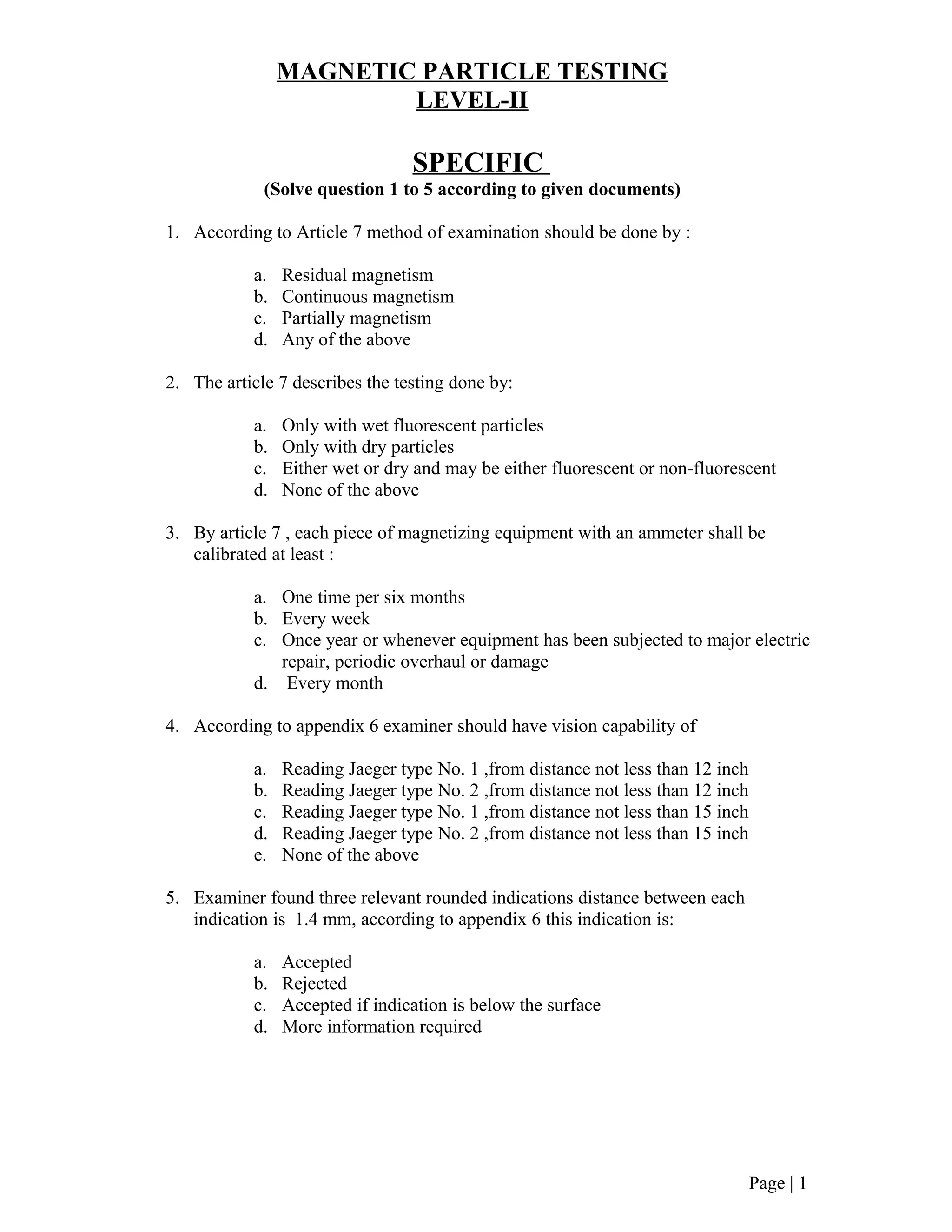The document discusses magnetic particle testing and contains 20 multiple choice questions related to topics like: methods of examination, equipment calibration requirements, examiner vision standards, interpreting magnetic particle indications, properties of magnetic fields, materials' magnetic behaviors, and factors that generate flux leakage. It provides the answers to the questions.