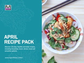 The document provides a 15-recipe package including breakfast, lunch, dinner and snack options. It includes recipes like Curried Scrambled Eggs, French Toast with Avocado and Fried Egg, Roasted Balsamic Tomatoes and Hummus Toast, Classic Hummus, Thai Chicken Salad, Avocado and Tuna Layered Salad, and Beef and Broccoli Stir-Fry. It also includes a weekly meal planner and shopping list to help implement the recipes for the week.