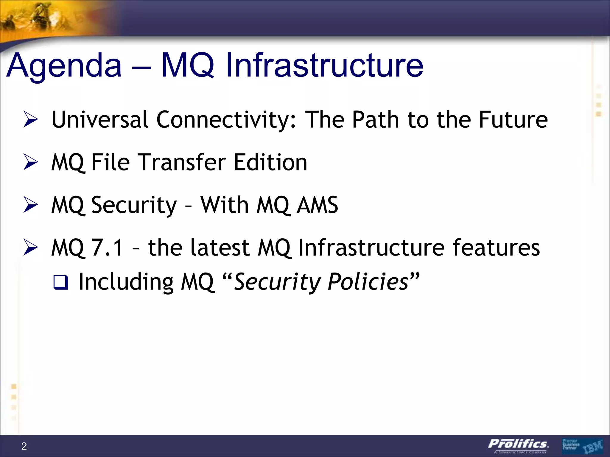 The document discusses IBM's MQ infrastructure including MQ 7.1, MQ AMS, and MQ FTE. It provides an agenda covering universal connectivity with MQ, MQ File Transfer Edition, MQ security with MQ AMS, and features of MQ 7.1 including security policies. The document is presented by AJ Aronoff from Prolifics and focuses on MQ infrastructure for security and high availability.