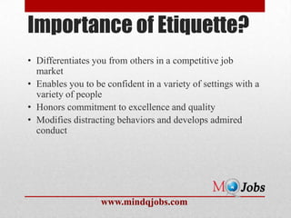 The document discusses the importance of etiquette during job interviews. It emphasizes that etiquette can differentiate a candidate from others, build confidence, and honor excellence. Proper etiquette includes greetings, handshakes, eye contact, introductions using titles and surnames, dressing professionally, and having good grooming and hygiene. Specific guidelines are provided for meeting people, shaking hands, taking leave, and dressing professionally for both men and women.