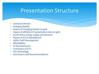 This document presents an analysis of the impact of electric vehicle (EV) penetration on South Africa's energy demand profile. It examines different EV charging models and their effects on the grid under various penetration rates ranging from 10% to 100%. While high EV penetration rates of 50-100% were found to increase peak energy demand, lower rates of 10-20% did not significantly impact the grid. The document also discusses South Africa's current energy supply and demand, cost considerations for consumers switching to EVs, limitations of EVs, and the potential for vehicle-to-grid technologies to help integrate higher shares of EVs by using batteries to store off-peak energy for sale during peak periods. It concludes that South Africa cannot currently accommodate
