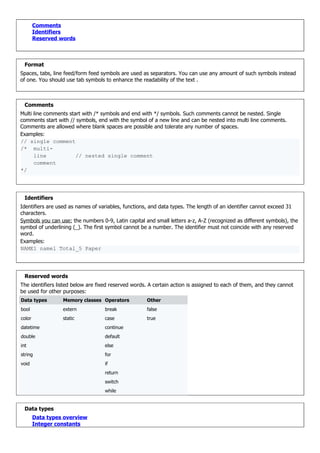 This document provides a summary of the MetaQuotes Language 4 (MQL4) programming language. MQL4 allows users to create expert advisors, indicators, scripts and libraries to automate trading strategies. The document covers MQL4 syntax including data types, variables, functions, operators and expressions. It provides examples and descriptions of commands for technical analysis, trading and working with arrays, strings, colors and dates.