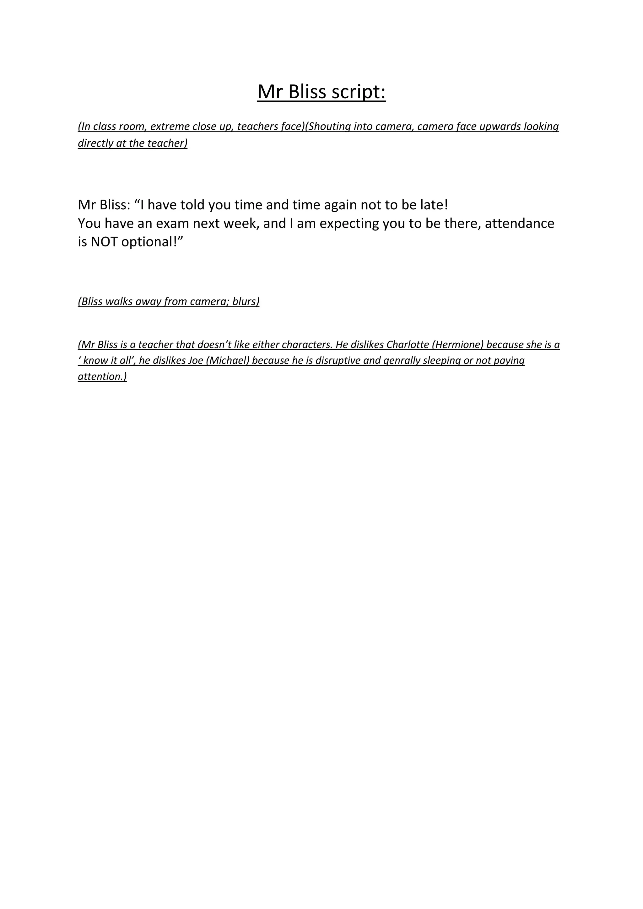 A teacher, Mr. Bliss, scolds students for being late to class in an extreme close-up. He reminds them of an upcoming exam and says attendance is mandatory. Mr. Bliss dislikes two students, Charlotte for being a know-it-all and Joe for being disruptive and not paying attention in class.