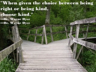 The document features a collection of inspirational quotes highlighting themes of kindness, boldness, and the value of questions over answers. It includes quotes from notable figures such as Dr. Wayne Dyer and Virgil, along with accompanying images credited to various photographers. The essence emphasizes the importance of choosing kindness and being open to learning.