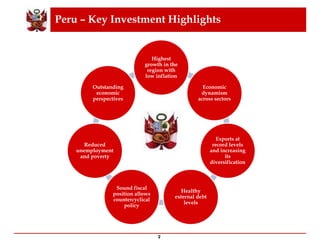 - Peru has healthy external debt levels, a sound fiscal position, reduced unemployment and poverty, and outstanding economic prospects.