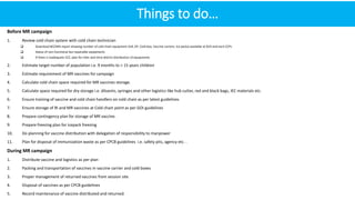 Cold chain management is crucial for the successful implementation of measles rubella vaccination campaigns. Key steps include reviewing existing cold chain equipment and capacity, estimating vaccine and logistical needs, ensuring adequate storage space for vaccines and diluents, planning for ice pack freezing, and developing contingency plans. Proper packing and transportation of vaccines while maintaining the cold chain is also important both during distribution and at vaccination sessions. Calculating cold chain space requirements and monitoring equipment is essential to reduce vaccine wastage.