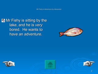 Mr. Fishy is bored by the lake until he is startled by a loud noise. He is then swept away by a large wave and fears for his life as a big boat passes over him, its propeller nearly cutting him up. Mr. Fishy just manages to escape and though frightened by his close call, declares it an exciting adventure once back in safety on the beach.