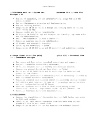 This document provides a summary of Gilbert S. Gonzales' qualifications and experience. It outlines his 22 years of experience in IT with a focus on project management, system administration, networking, and telecommunications. His most recent roles include IT manager positions at Transcosmos Asia Philippines and Hinduja Global Solutions, with responsibilities such as managing IT operations, projects, vendors, and client relationships.