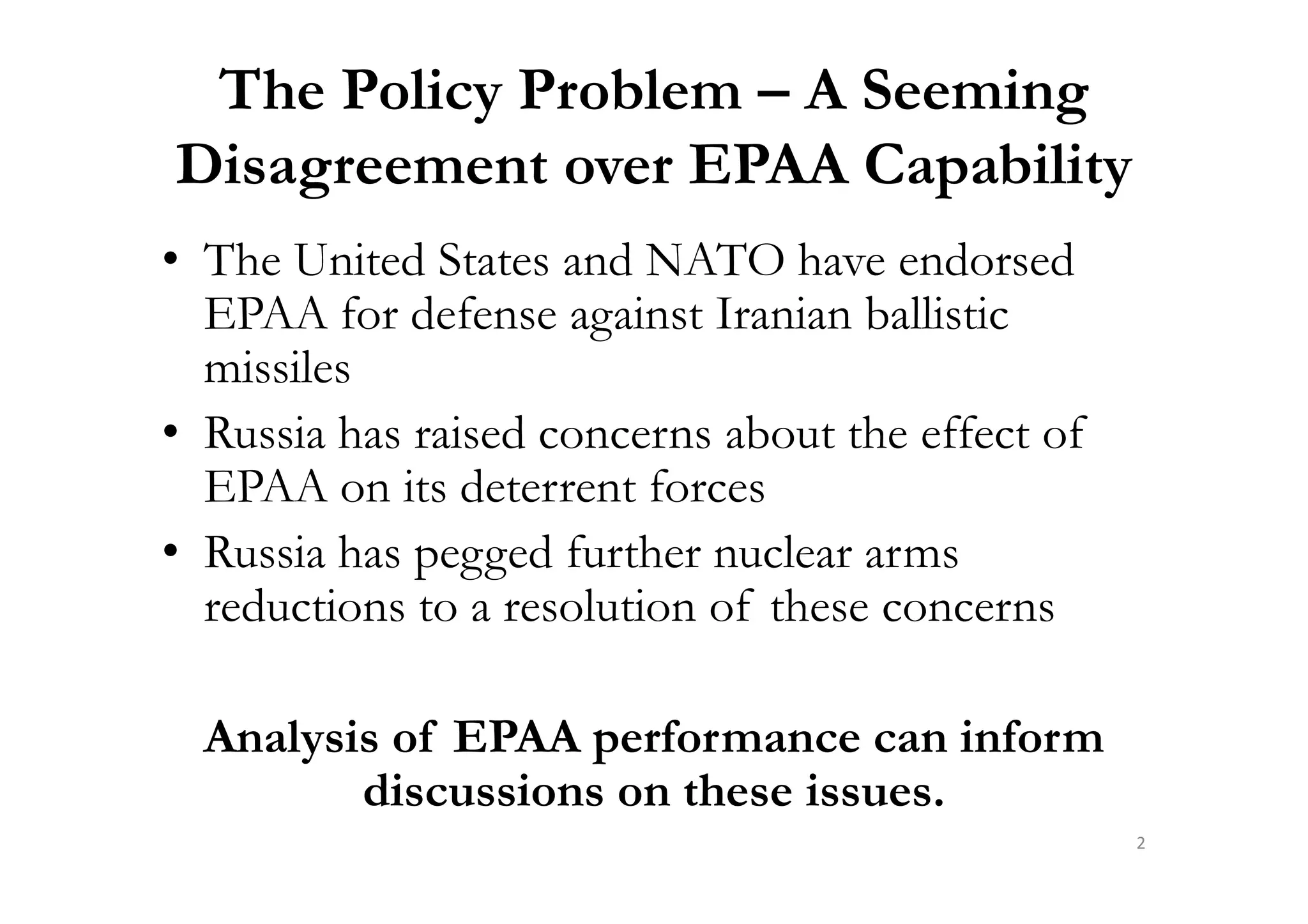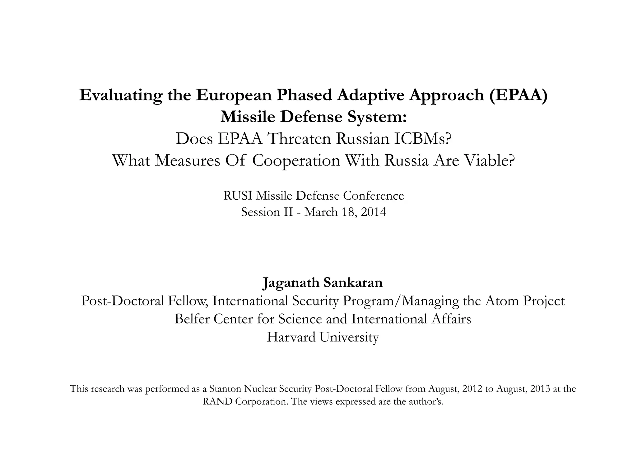 The document evaluates the European Phased Adaptive Approach (EPAA) missile defense system, particularly whether it threatens Russian intercontinental ballistic missiles (ICBMs). Analysis indicates that the currently planned interceptors under EPAA lack the capability to effectively defend against Russian ICBMs, especially after the cancellation of the SM-3 Block IIB interceptor. Additionally, it discusses potential avenues for cooperation between NATO and Russia in missile defense matters.