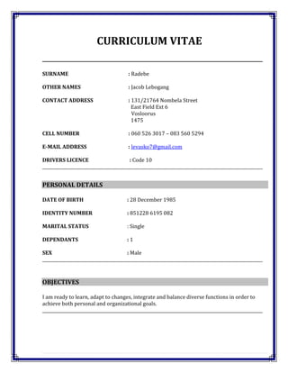 This curriculum vitae is for Jacob Lebogang Radebe. He has over 10 years of experience in the financial services industry working as a member specialist, consultant, credit controller and customer service representative. He has a matric certificate and qualifications in wealth management and regulatory examinations. His hobbies include reading, exploring, playing sports and listening to music. He has strong communication, administrative, and customer service skills.
