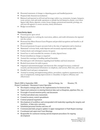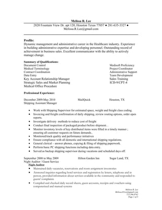 Melissa Lee has over 10 years of experience in administrative, project coordination, and customer service roles in the healthcare and hospitality industries. She has strong skills in document control, data entry, project management, sales, and customer service. Her background includes positions as a shipping assistant manager, night auditor, project coordinator, administrative support specialist, and account executive.