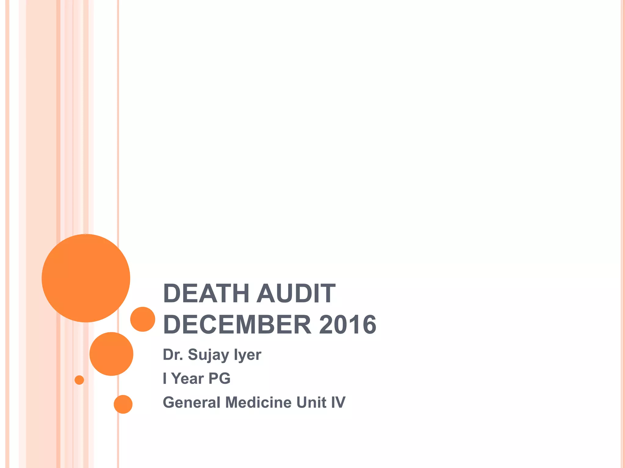 This document summarizes a death audit report for a 67-year-old male patient who passed away after being admitted for 3 days. The patient initially presented unconscious after suffering a stroke. He developed complications including heart arrhythmias, kidney injury, and deteriorating neurological function. Despite attempts at resuscitation, the patient went into asystole and could not be revived. The causes of death were determined to be a cerebrovascular accident exacerbated by underlying conditions of hypertension, coronary artery disease, and kidney injury.