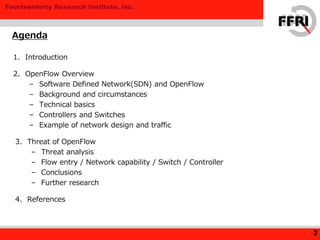 This document provides an overview of OpenFlow technology and analyzes potential security threats. It describes OpenFlow and SDN concepts, the OpenFlow specification version 1.0, and example network designs using OpenFlow. The document then analyzes threats to OpenFlow assets like flow entries and network capabilities. Specific threats addressed include information leakage, traffic tampering, denial of service attacks, and system hacking. Countermeasures suggested involve using TLS, hardening switches and controllers, adding redundancy, and restricting traffic.