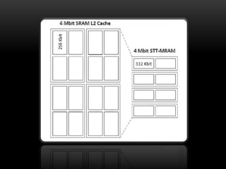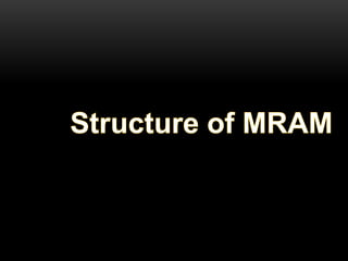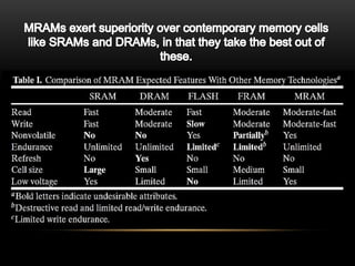 The document discusses the challenges posed by Moore's Law to integrated circuits, particularly concerning power dissipation and thermal noise, leading to a potential shift towards magneto-resistive RAM (MRAM) as a solution. MRAM offers advantages such as non-volatility and high-speed performance, with various types like STT-MRAM and FW-MRAM presented for mobile applications and logic computing. Additionally, it highlights recent research developments and potential industry applications of MRAM technology.