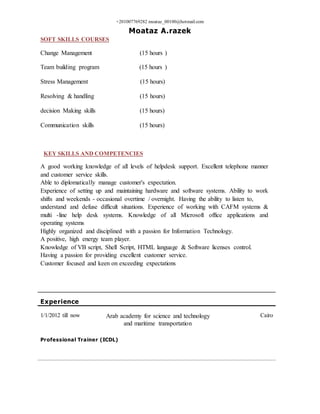Moataz Razek is seeking a career advancement opportunity as an IT administrator. He has over 10 years of experience in roles such as network administrator, system administrator, helpdesk support, and ICDL professional trainer. He is proficient in Microsoft operating systems, networks, security, and various software programs. He has several technical certifications and has strong communication, troubleshooting, and customer service skills.